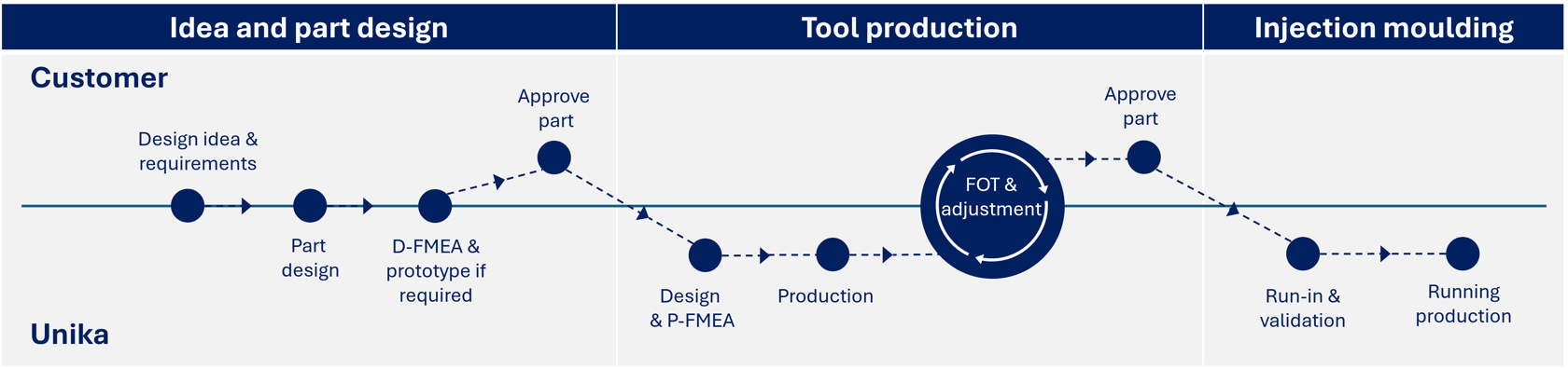 The development process is a collaboration in which we act as your injection moulding experts. Each project is assigned an experienced team consisting of: