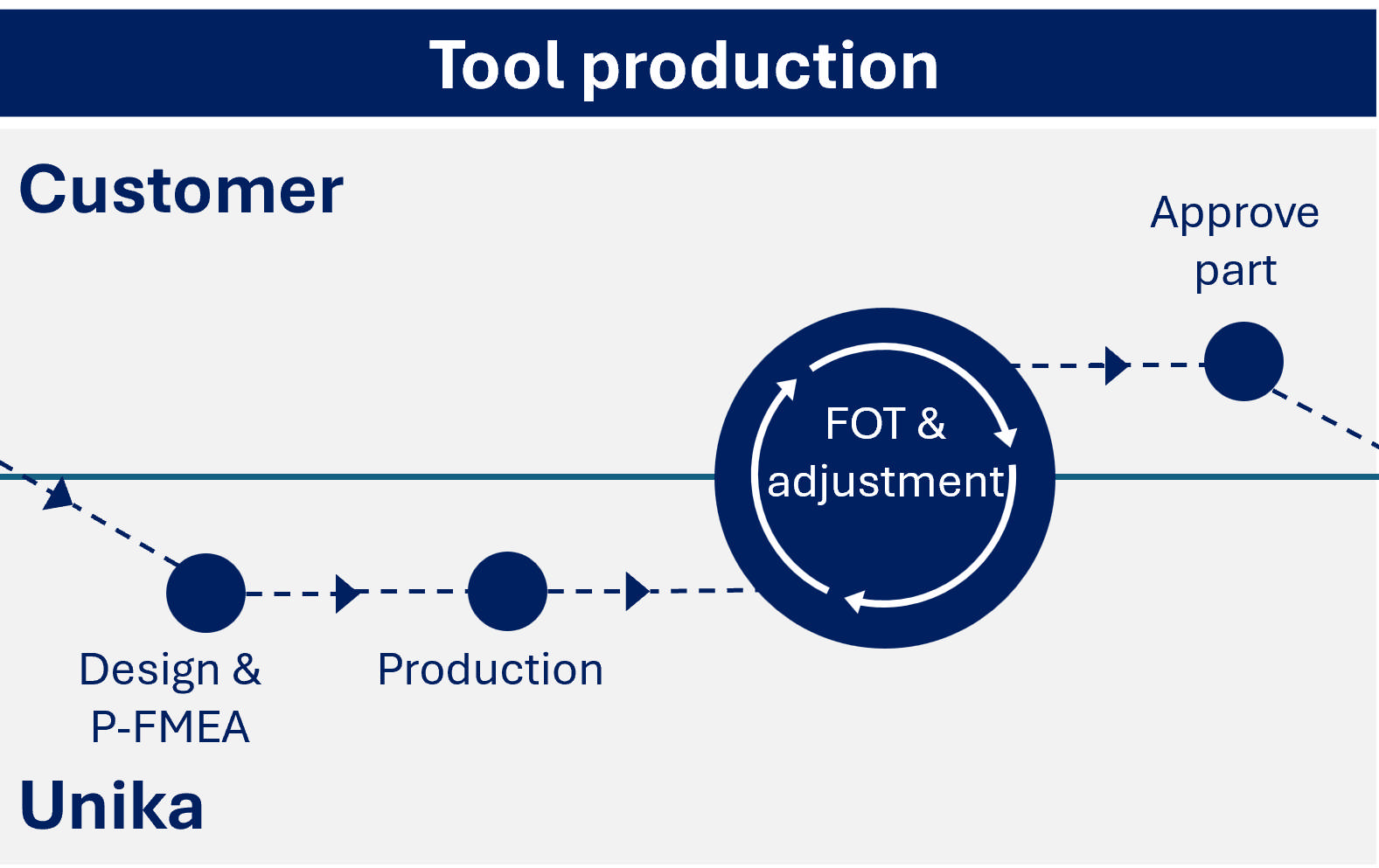 When we manufacture tools in-house at Unika, we guarantee precision from the very beginning. Tool design, FOT, and validation are carried out in close collaboration with you.
